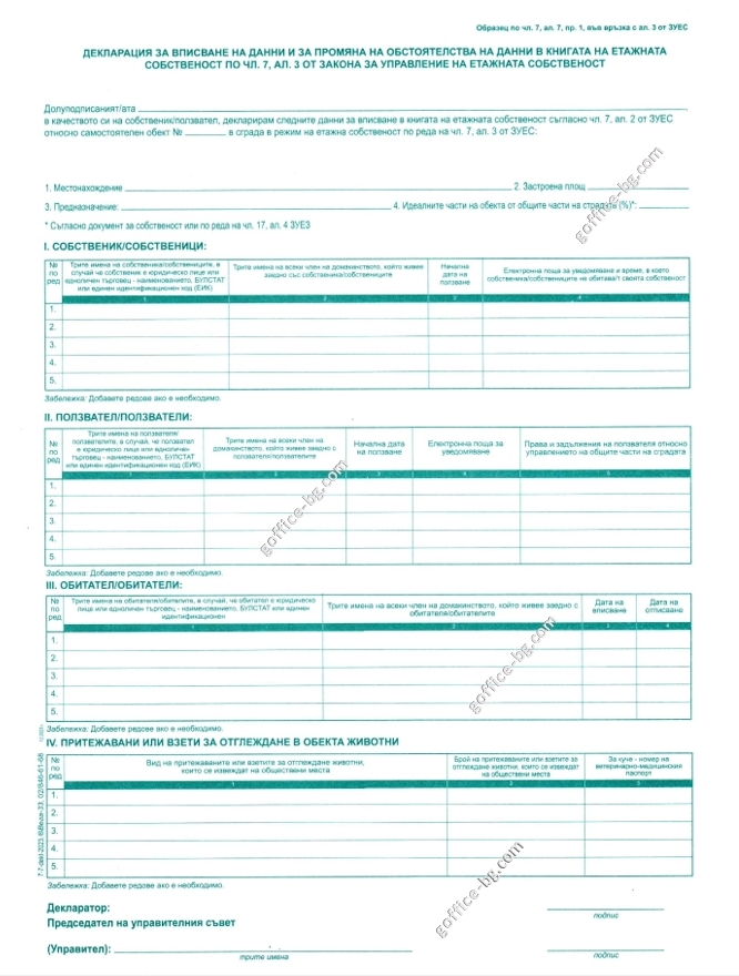Декларация за вписване на данни и за промяна на обстоятелства на данни в книгата на етажната собственост