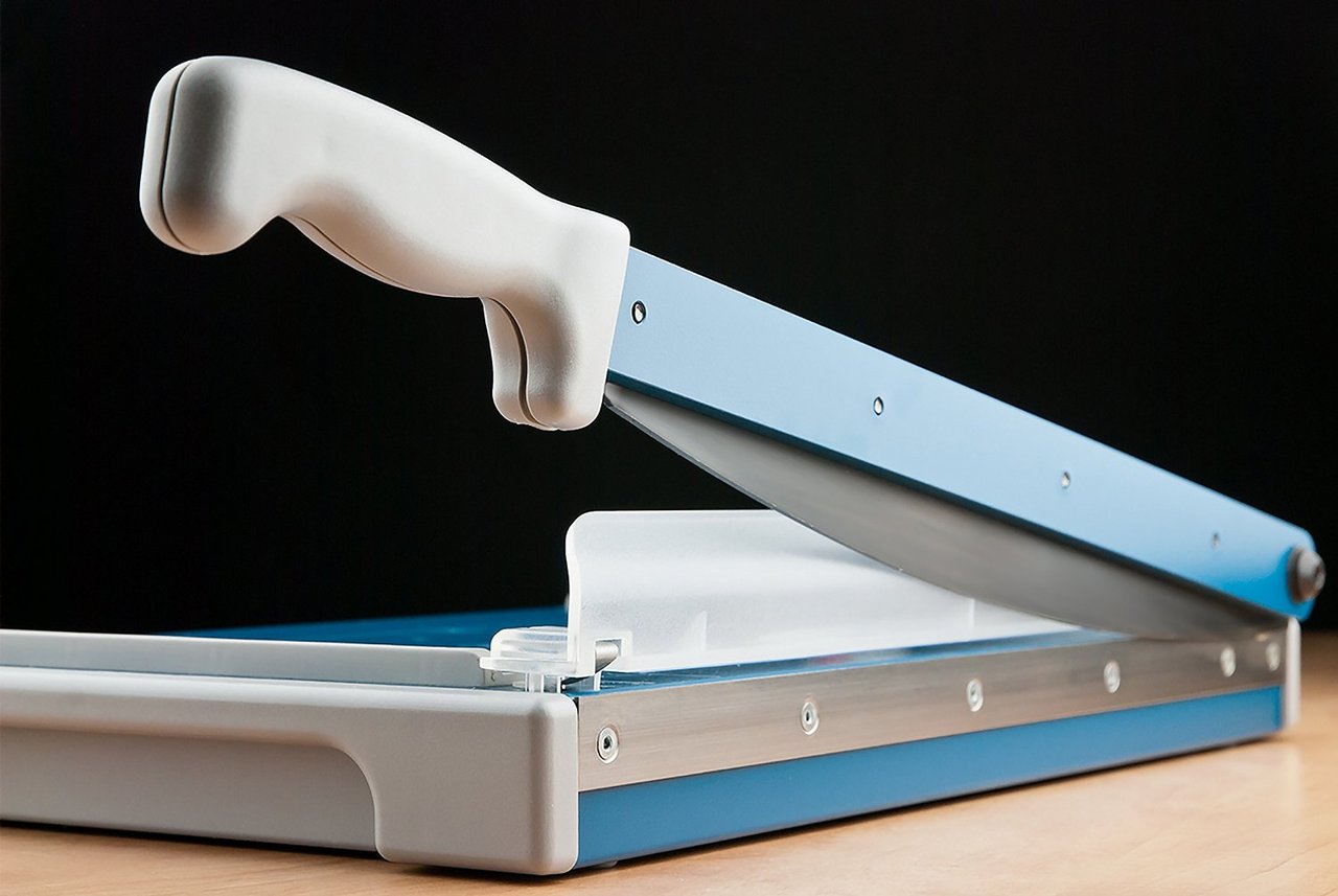 Гилотината има ергономична дръжка с прозрачен предпазител за максимална сигурност