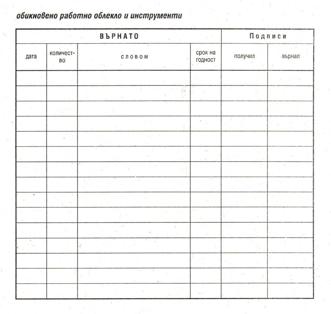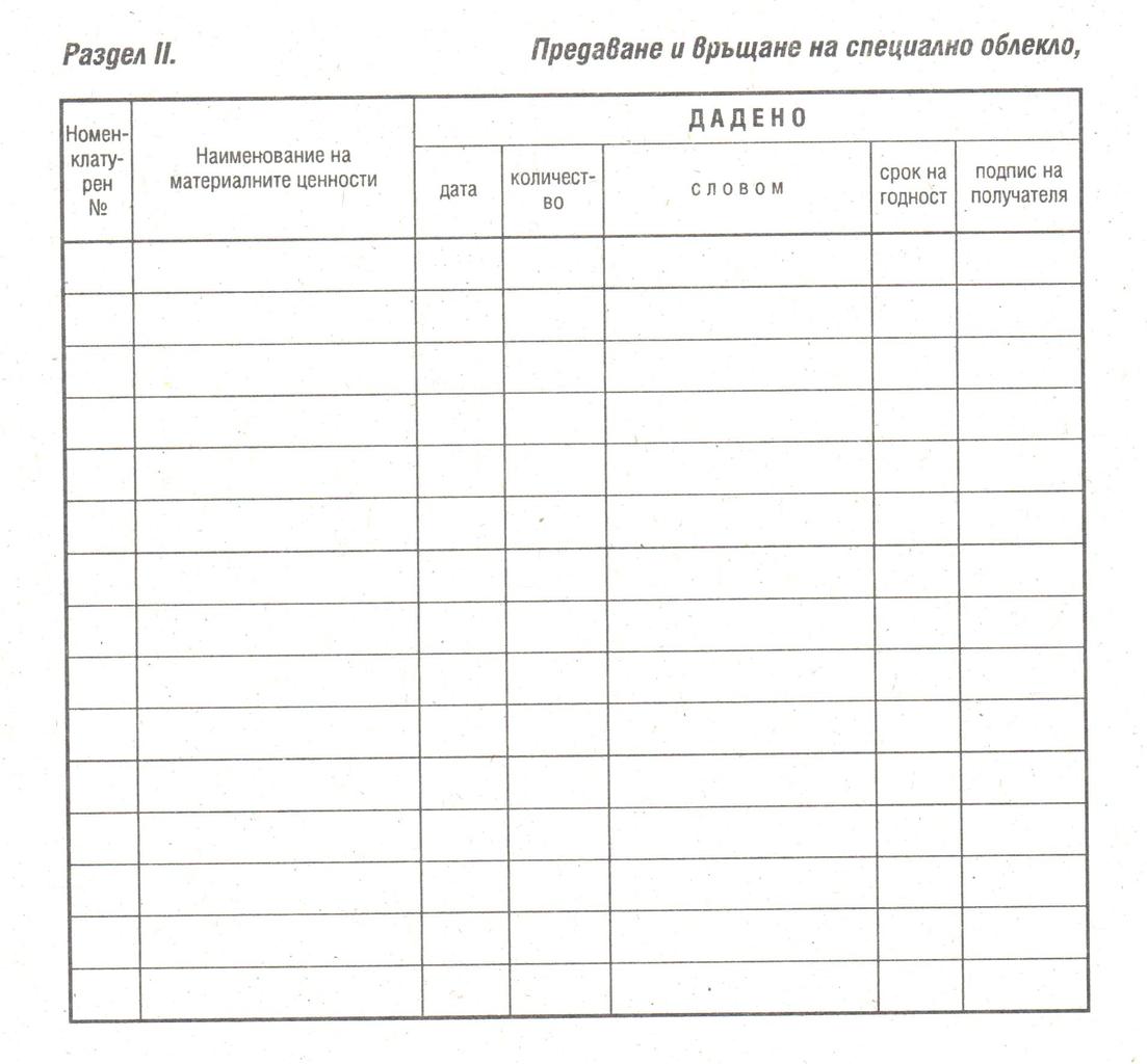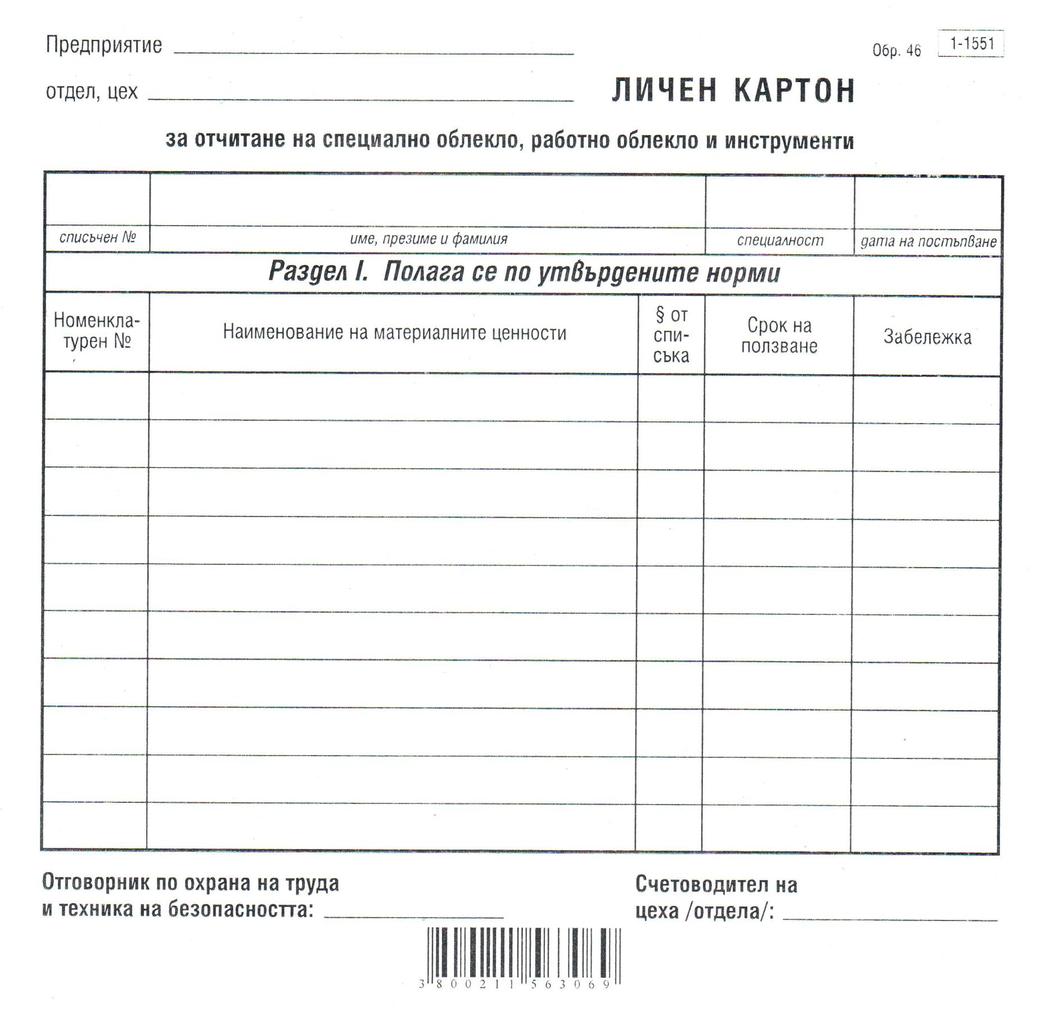 Личен картон за отчитане на специално облекло, работно облекло и инструменти