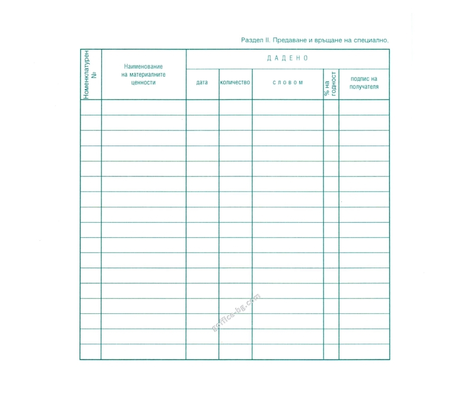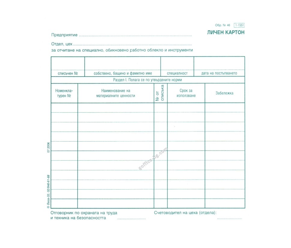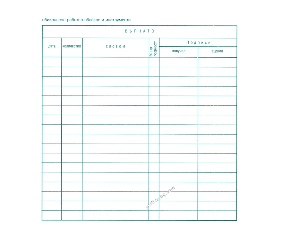 Личен картон за отчитане на специално облекло, работно облекло и инструменти