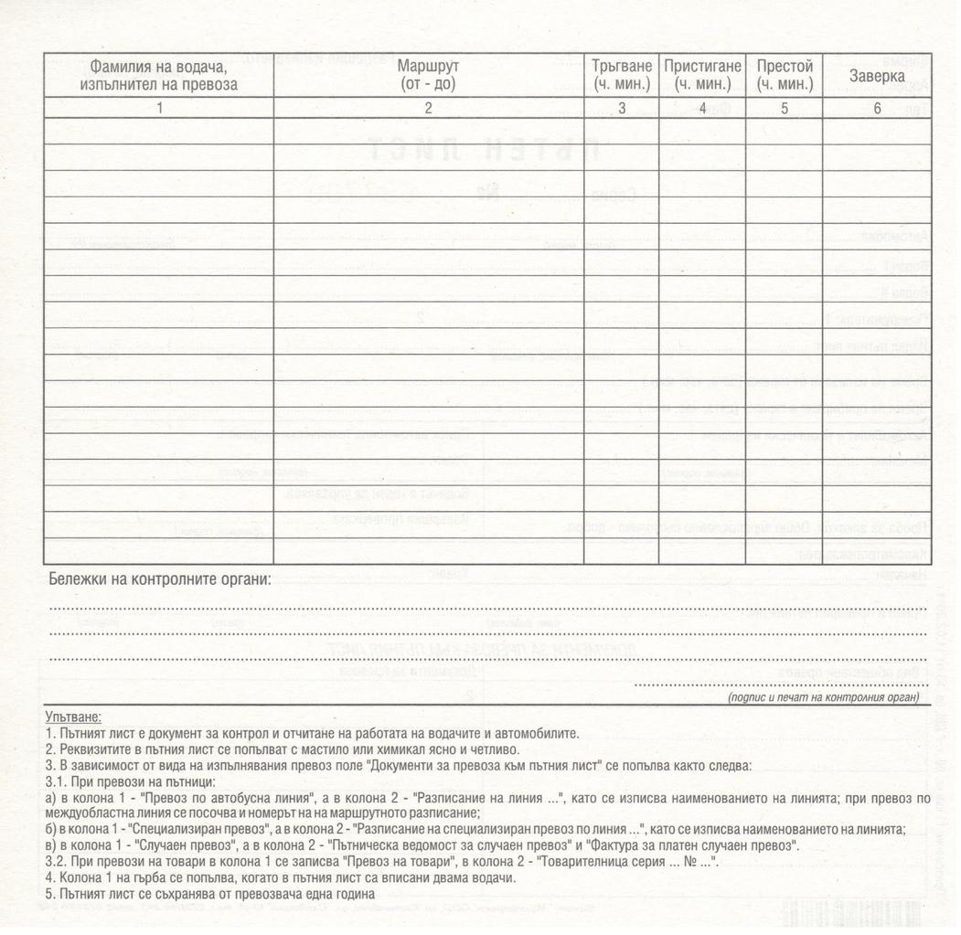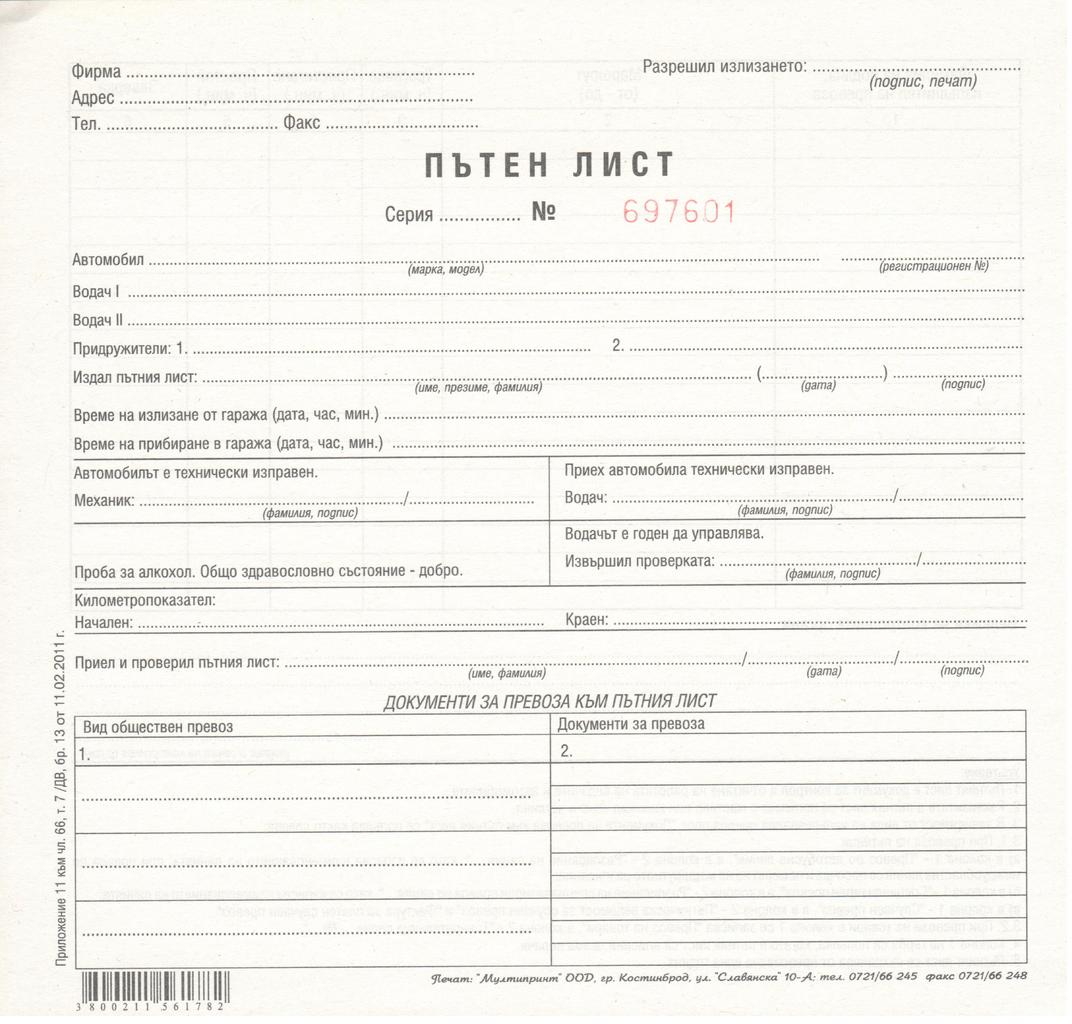 Пътен лист с индивидуален номер на всеки лист