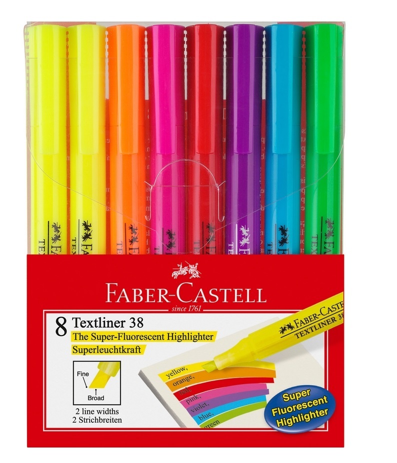 Комплекта съдържа 7 флуоресцетни цвята: 2 броя неоново жълто, 6 неонови цвята (розов, зелен, оранжев, червен, син, виолетов)