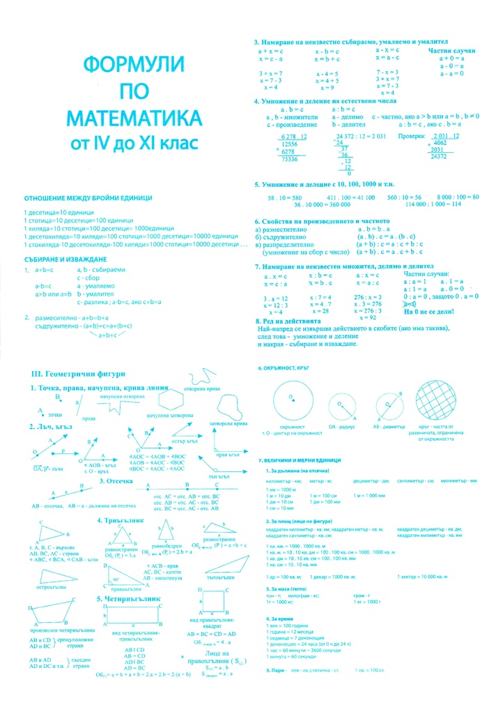 Накрая на тетрадката има допълнение с формули по математика от IV до ХI клас